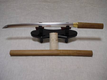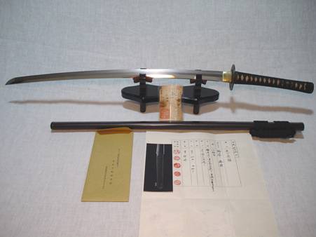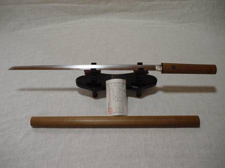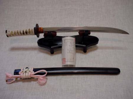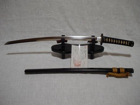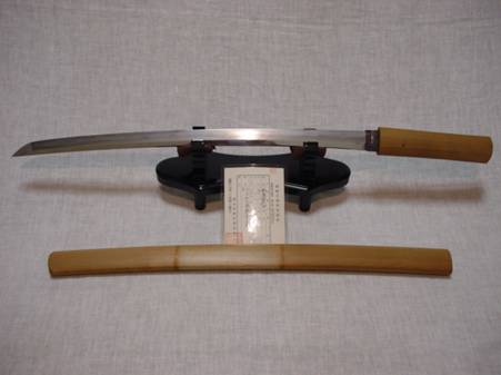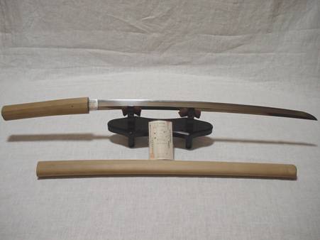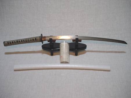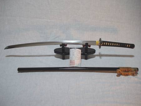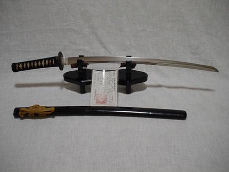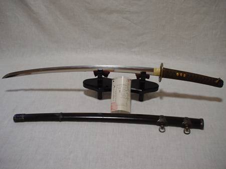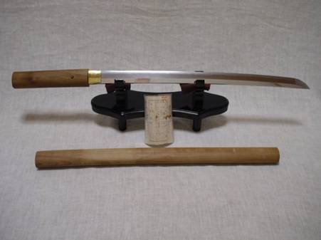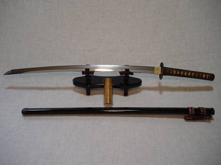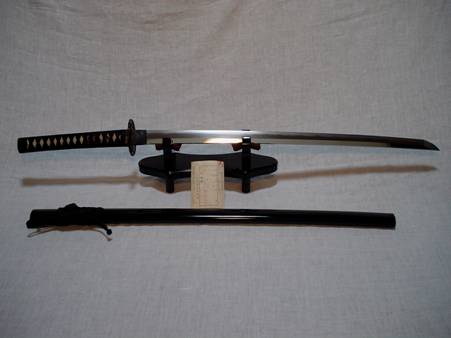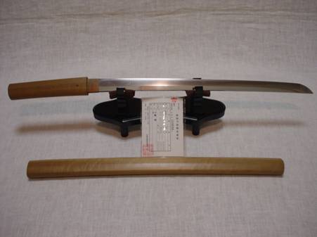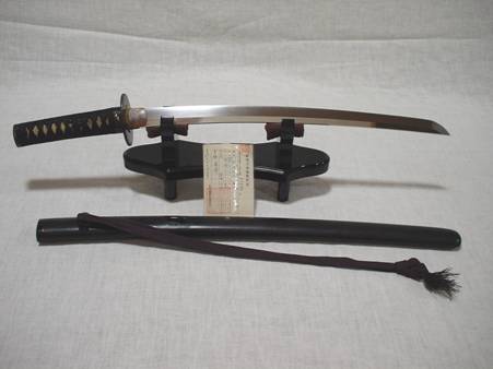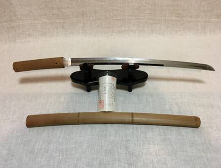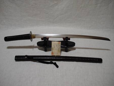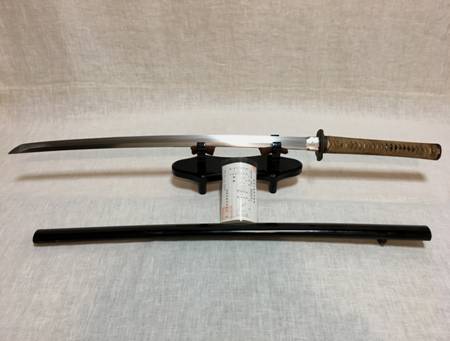 拵え:打刀拵え(柄前は時代物、一重ハバキ、現代鍔、黒の塗鞘【栗形、かんたんな下緒付き】)