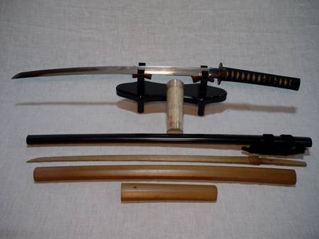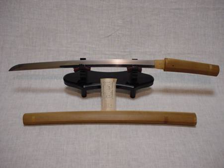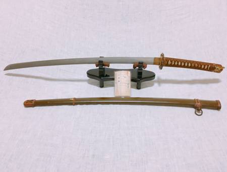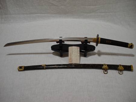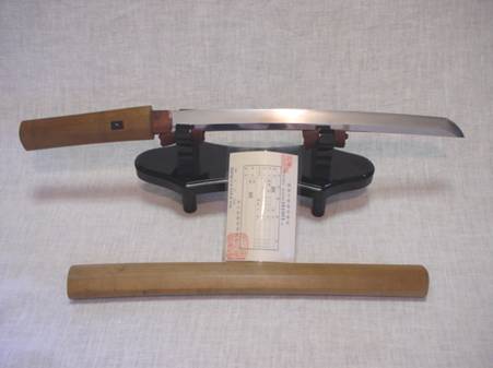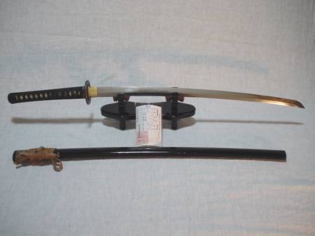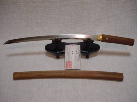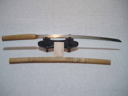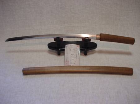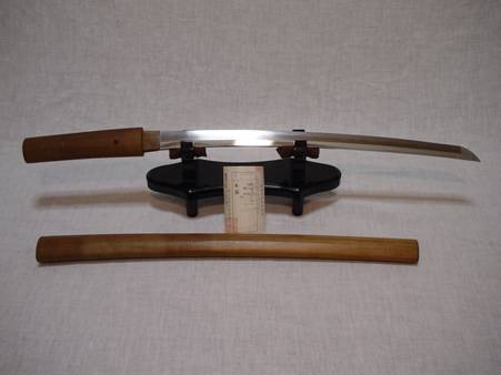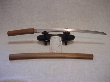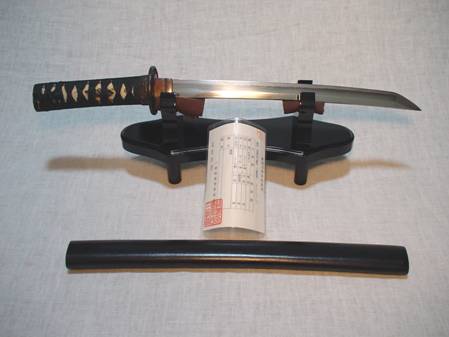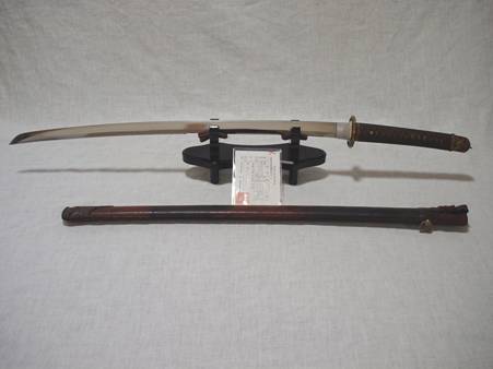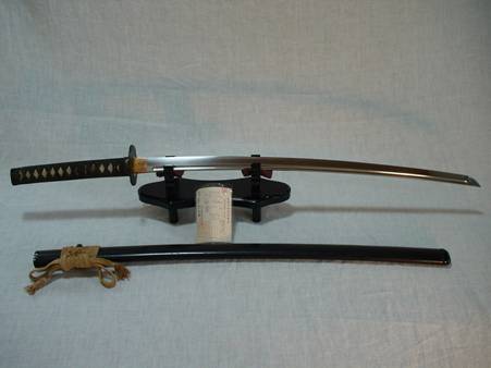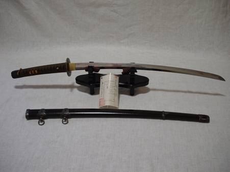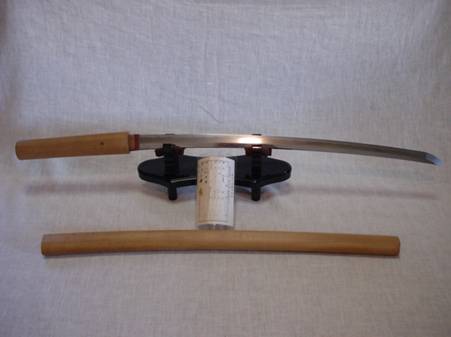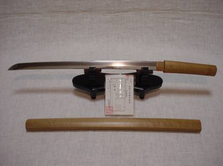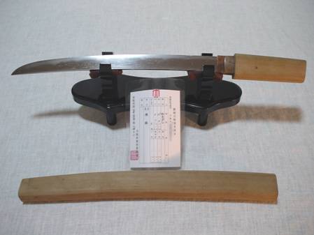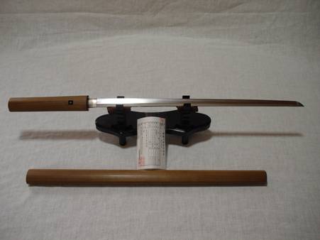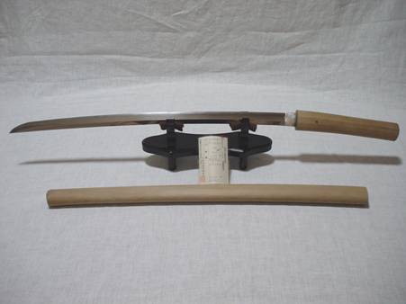 拵え:打刀拵え(柄前は時代物、一重ハバキ、現代鍔、黒の塗鞘【栗形、かんたんな下緒付き】)